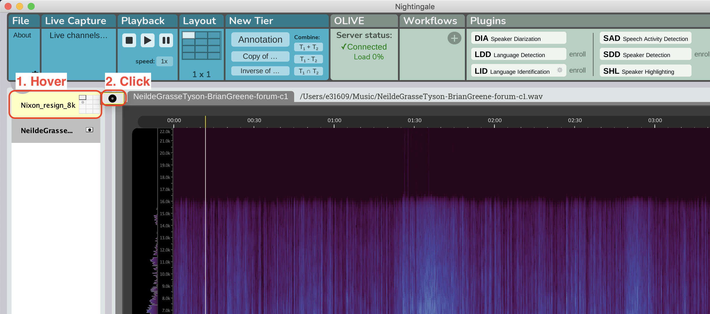 In addition to HLT capabilities Nightingale includes several built-in tools to help users navigate and manipulate audio files for analysis and submission to algorithms. Below are the descriptions of these basic tools and how to use them.